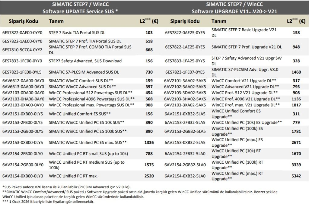 olarak tedarik edilecektir. - SUS paketi, bir yıl süreyle geçerli olup yalnızca TIA Portal V20 lisansı olan kullanıcılar tarafından